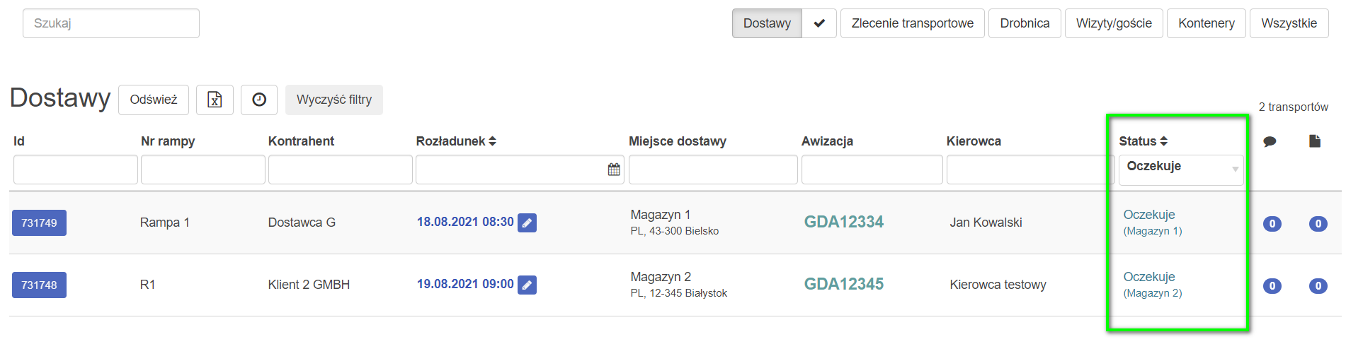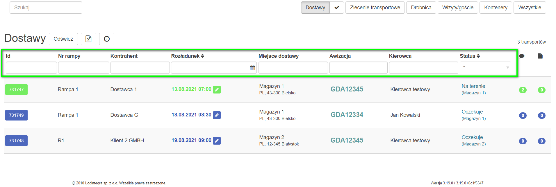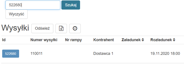 - W tabeli zostaną wyświetlone wszystkie transporty pasujące do danego wyszukiwania: