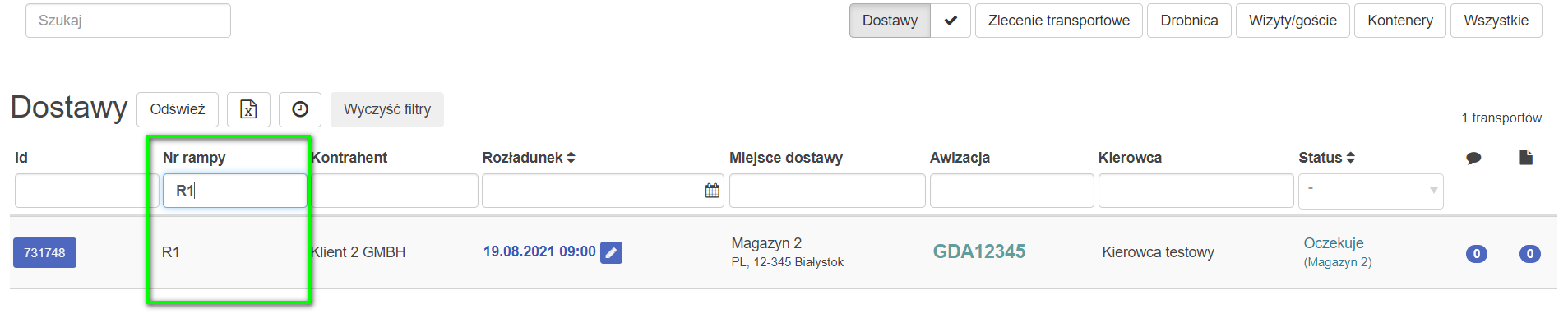 W tabeli transportów dostępna jest wyszukiwarka transportów. Gdy w tabeli jest duża ilość transportów można skorzystać z wyszukiwarki: