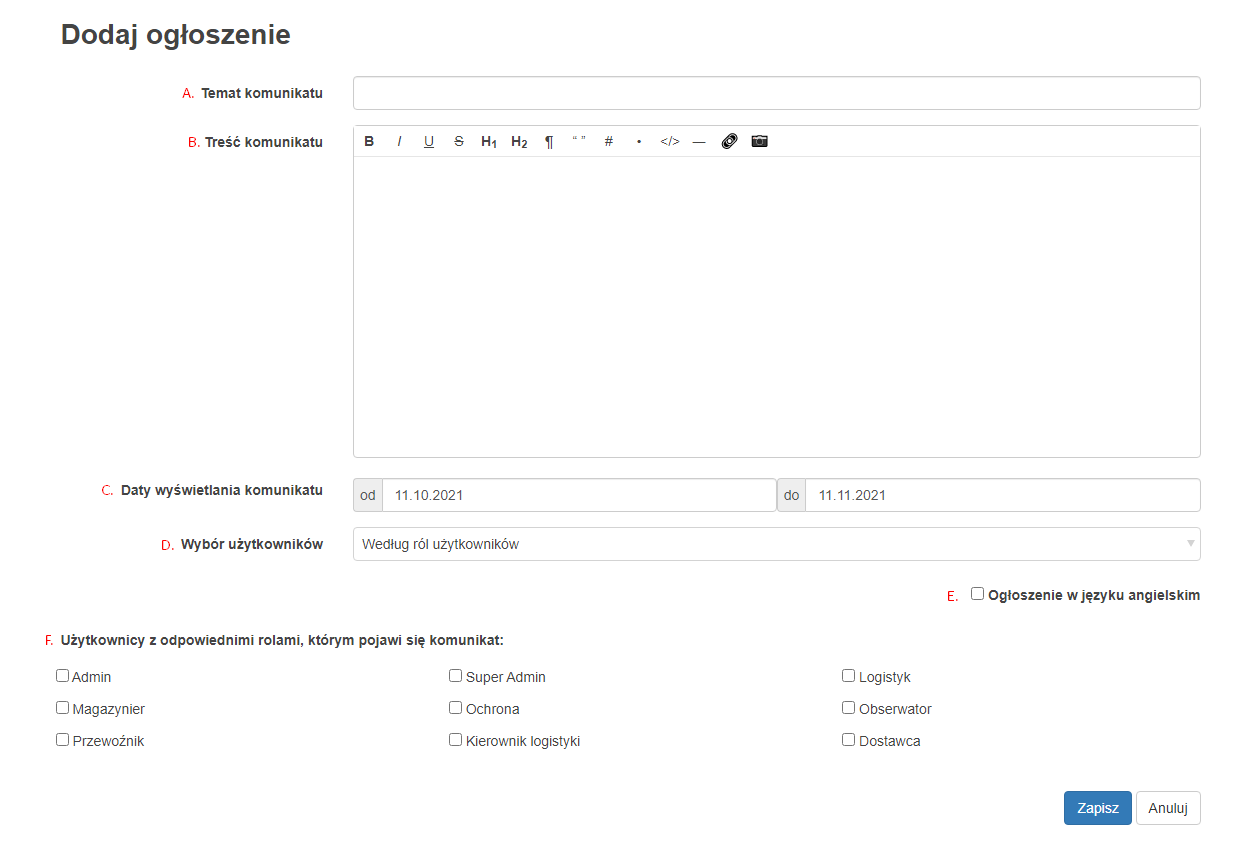 F. Użytkownicy z odpowiednimi rolami, którym pojawi się komunikat - W zależności do wyboru z podpunktu D wybierz dla jakich ról/firm ogłoszenie ma być widoczne.