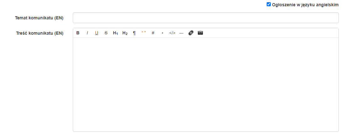 E. Ogłoszenie w języku angielskim - Po zaznaczeniu tego pola ukażą się dodatkowe pola do uzupełnienia ogłoszenia w języku angielskim. Ogłoszenie będzie dostępne dla Użytkowników korzystających z przeglądarki z ustawieniem językowym innym niż język Polski: