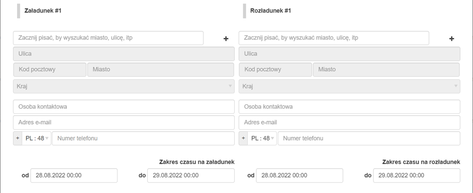- Zakres czasu na załadunek/rozładunek– podaj zakres czasu na załadunek/rozładunek. Uwaga, niektóre serwisy kurierskie wymagają podania dokładnego zakresu godzinowego. Prosimy więc o podanie poza datą również wartości godzinowych,