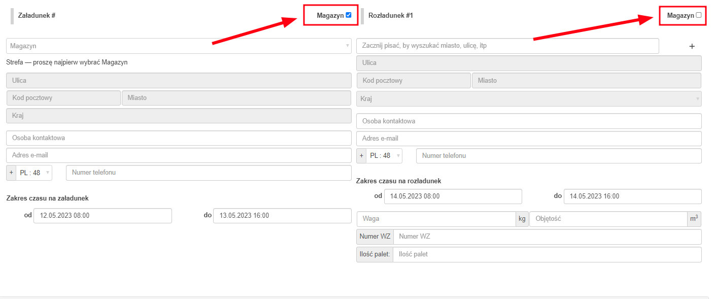 Podczas tworzenia zlecenia transportowego istnieje możliwość określenia, czy miejsce załadunku/rozładunku ma być magazynem istniejącym w systemie.
