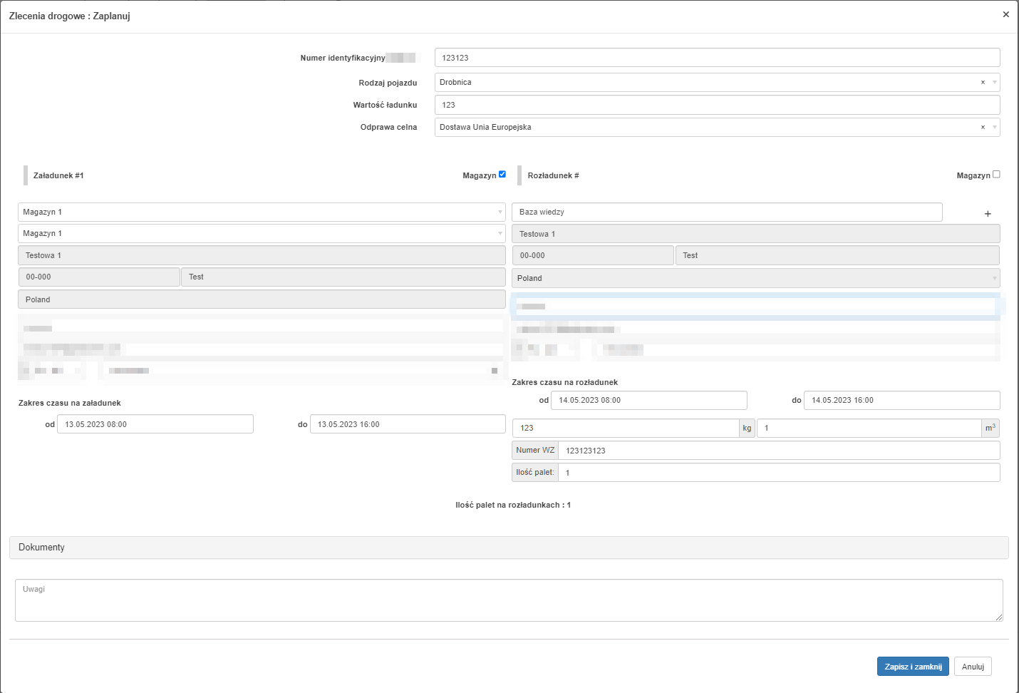 - Wypełnij formularz zlecenia, oznaczając miejsce załadunku/rozładunku jako magazyn i kliknij Zapisz i zamknij.
