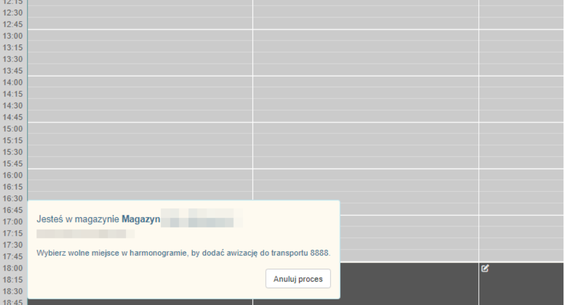 Wybranie magazynu jako miejsca załadunku/rozładunku umożliwia ustalenie okna czasowego, zarezerwowanego wyłącznie dla utworzonego transportu w wybranych przez Użytkownika godzinach. Pozwala to na obserwację nadchodzących załadunków lub dostaw z poziomu widoku Harmonogramu.