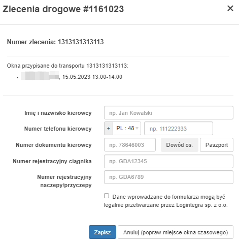 - Uzupełnij dane kierowcy oraz pojazdu w sekcji awizacji,